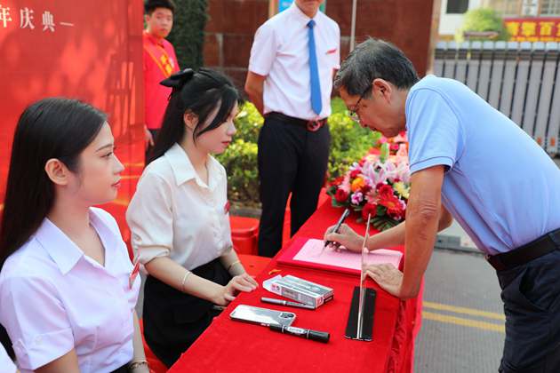 在20周年校庆的盛典上,一位与学校渊源深厚的挚友向学校送来了诚挚问候并发表了深情而真挚的致辞。作为学校二十年成长历程的见证者与校园文化的早期设计参与者,当代雕塑艺术家、书画家,北京明远教育研究艺术总监君艺豪先生向我校赠送范曾先生真迹“行稳致远”字幅,以及清朝嘉庆年间陈继昌状元真迹“金榜题名”牌匾。君先生动情回顾了与黄尚泽董事长当年怀揣“让平果孩子在家门口享受优质教育”的朴素初心,共同勾画蓝图的往昔岁月。最后,君先生寄望三中在黄尚泽董事长的带领下,在崭新起点上行稳致远,继续领航民办教育,助力更多学子从此走向更广阔的山海。
