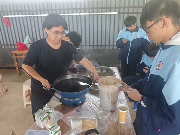珍珠奶茶制作环节为研学之旅拉开暖心序幕。指导老师细致讲解珍珠熬煮的火候把控、茶底萃取的时间节点与奶液调配的黄金比例,从原料特性到操作禁忌逐一细致讲解,辅以现场示范让理论知识变得直观可感。在老师的悉心引领下,同学们分组协作、有条不紊,搅拌熬煮间,颗颗珍珠渐显软糯Q弹;经精准配比,茶香与奶香完美交融。指尖翻飞间,一杯杯香气氤氲的珍珠奶茶新鲜出炉,每一口甜润都承载着手作的温度,同学们在沉浸式实践中收获新技能,于味蕾的满足中收获满满的成就感。
