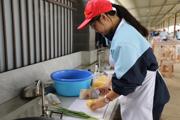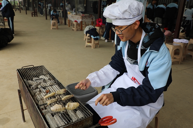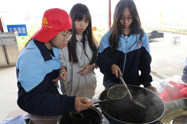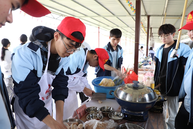 园间灶台烟火浓,协作烹鲜乐未穷。烹饪区与蔬果园联袂构成的实践天地里,一场热火朝天的厨艺比拼精彩上演。同学们分组协作,各展其能。摘菜洗切,身影穿梭有序;掌勺调味,火光映照专注。锅铲声、翻炒声交织成曲,寻常食材在合作中化为盘中山水。