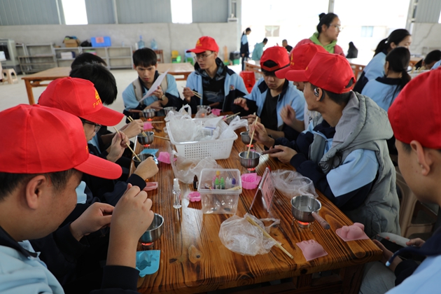 巧思凝脂塑芳华,皂彩流转见慧心。手工皂创作环节,是创意与匠心的激情碰撞。指导老师李爱华结合化学原理,带领同学们了解皂基的成分特性、融化温度控制要点,以及油脂与碱液的皂化反应原理,还特别提示了不同配料的添加顺序对皂体质地与功效的影响。