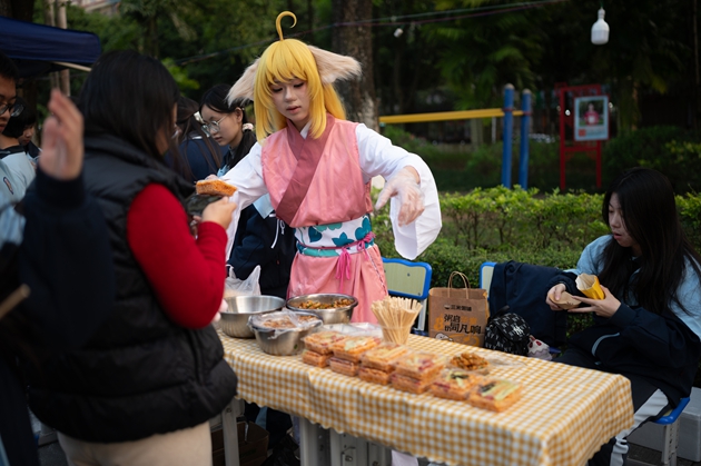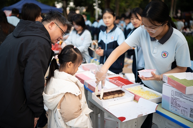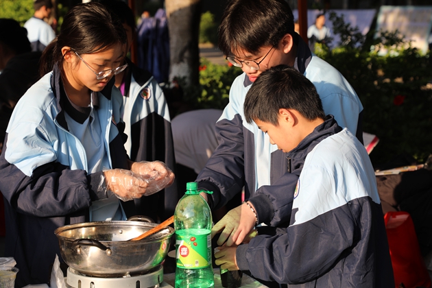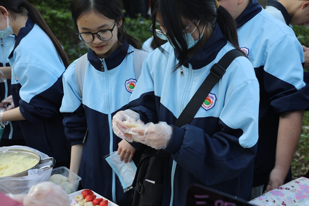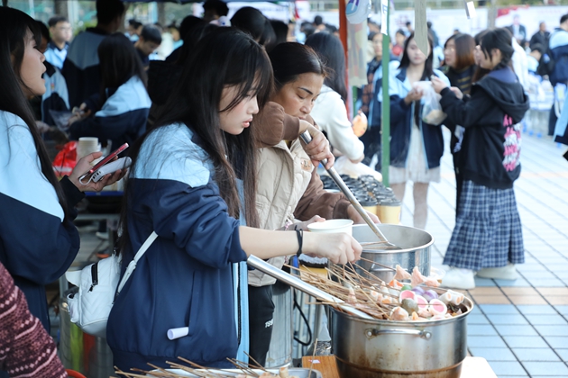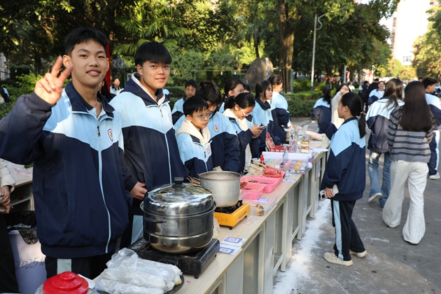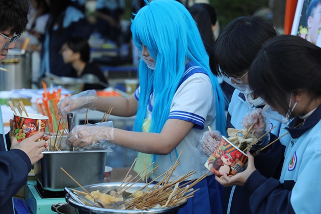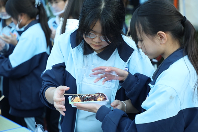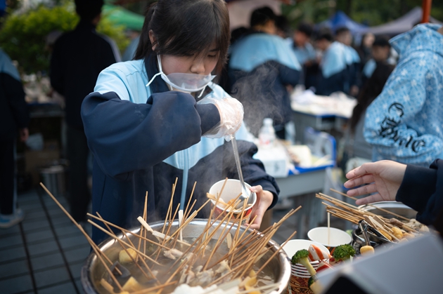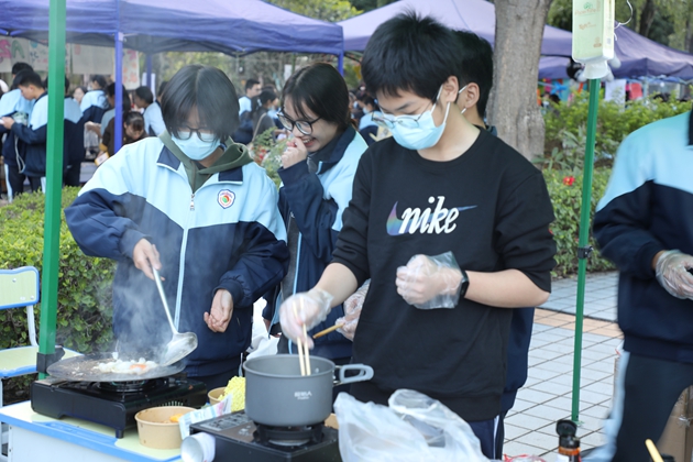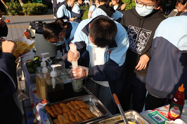 活动现场,美食一条街无疑是最热闹的区域。各班摊位整齐排列,五彩的招牌迎风招展,吆喝声、欢笑声此起彼伏。同学们化身“小掌柜”,分工明确、配合默契:有的系着围裙,在热锅前熟练地翻炒着食材,金黄酥脆的炸薯条、香气扑鼻的烤肠、酸甜可口的手工糖葫芦接连出锅;有的专注地调制着饮品,手打柠檬茶的清香、鲜榨果汁的甘甜,吸引了大批师生驻足;还有的负责摆盘售卖,将精心制作的寿司、蛋挞、凉拌菜摆放得错落有致,还贴心地准备了试吃小份。从食材采购、清洗加工,到定价售卖、收银记账,每一个环节都由学生亲力亲为,他们脸上洋溢着认真又兴奋的神情,用亲手制作的美食,传递着新年的喜悦。