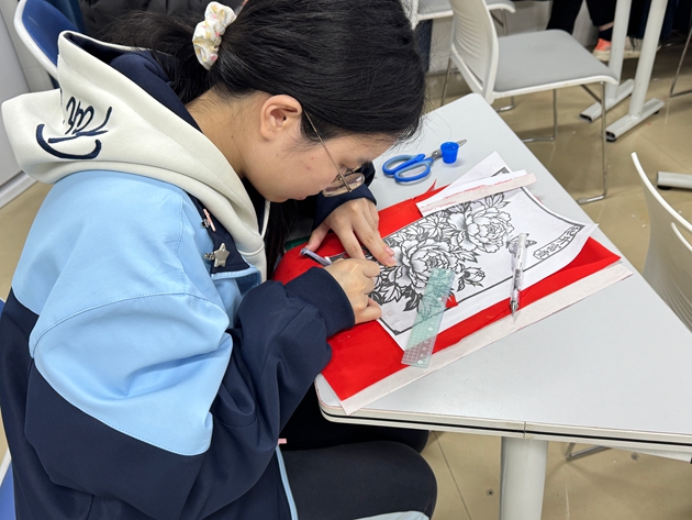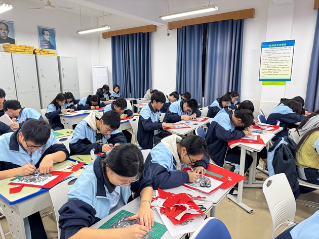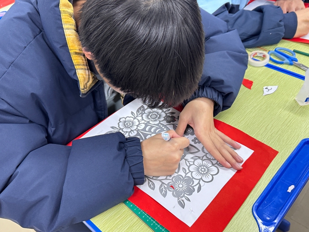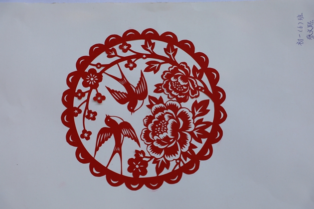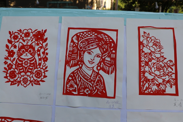 剪纸作品更是吸睛无数,灵动的花鸟鱼虫、喜庆的福字窗花、栩栩如生的人物剪影,皆由同学们以剪刀为笔、红纸为纸,在折叠与裁剪间幻化出万千姿态,精巧的纹路、生动的造型,尽显传统技艺之美。观展师生频频驻足,细细品味,不时发出由衷的赞叹。