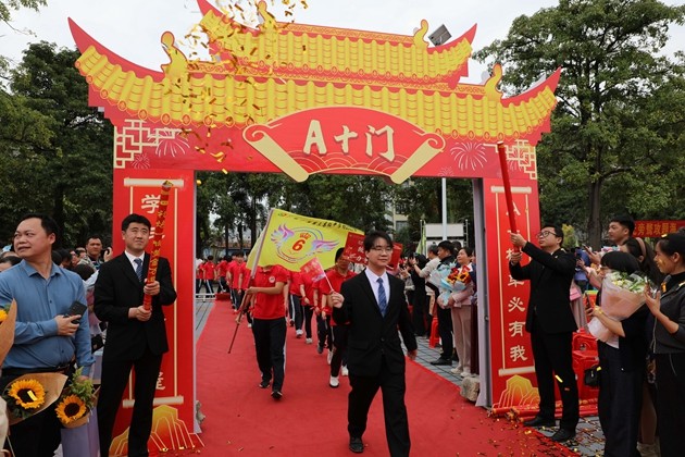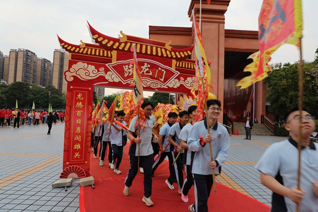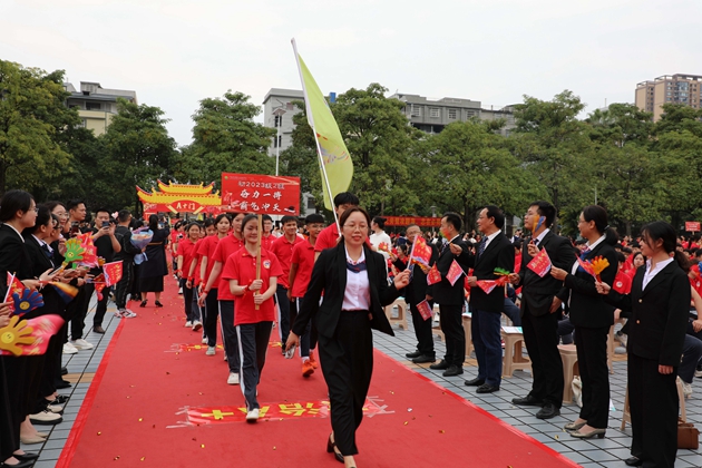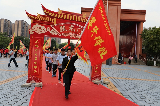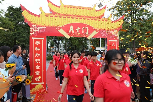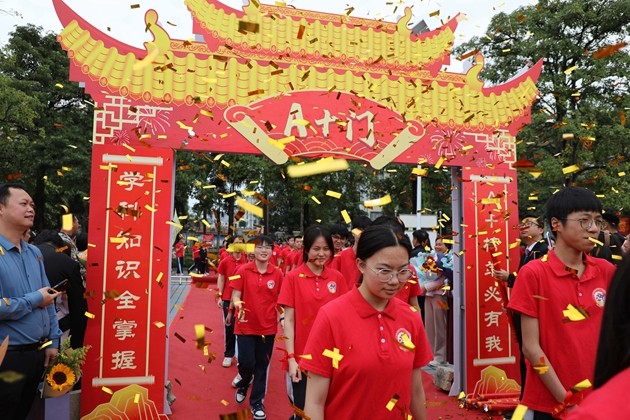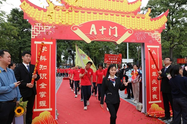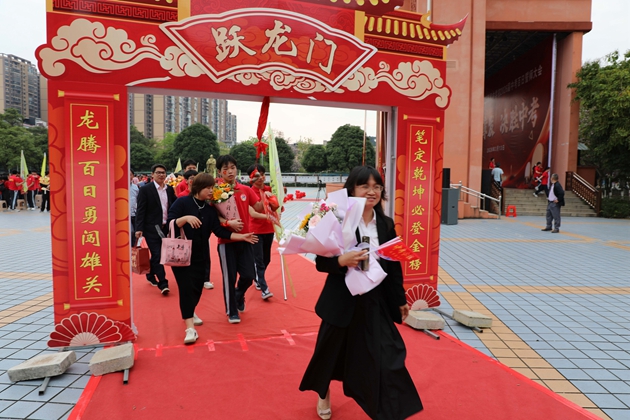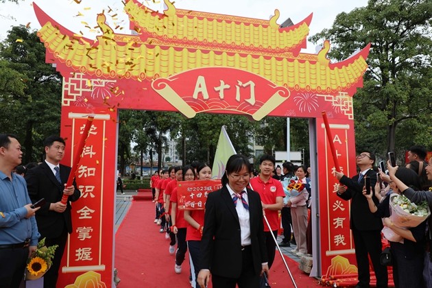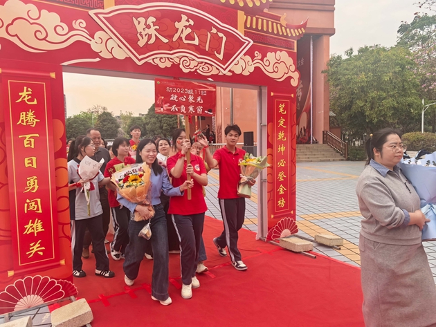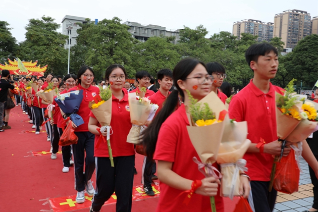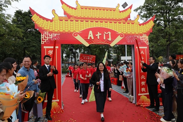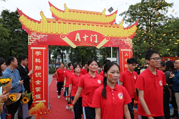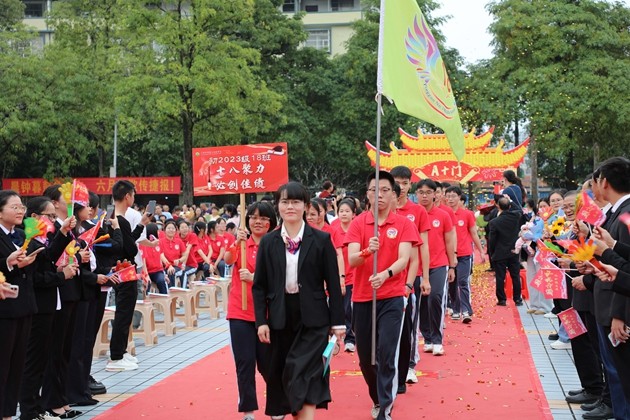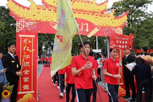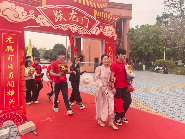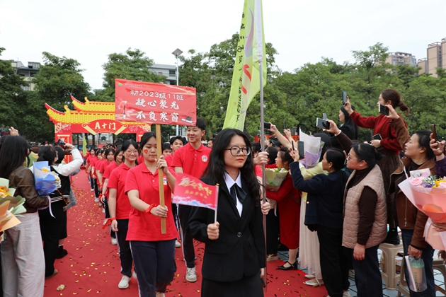 舞龙少年昂首挥杆,黄龙蜿蜒穿梭于繁花掩映的红毯之上,鳞光熠熠;鼓手们抡臂落槌,鼓点铿锵如战歌,撞碎春日晨雾。领导振臂挥旗,“得胜”红绸猎猎舒展,初三各班学子身着整齐校庆服,昂首挺胸、步伐坚定,跨越A+门,阔步A+大道。礼花如漫天金蕊凌空漫落,那都是中考逐梦的星光;两旁恩师躬身鼓劲,尽为征帆护航的暖阳。同学们的每一步都踏满少年意气,每一个身影都彰显着冲刺中考的自信与决心。与科任老师们挥手的瞬间,既是对过往寒窗苦读的致敬,更是对百日冲刺、决胜六月的庄严宣告,少年们以无畏之姿,奔赴这场属于青春的奋斗之约。