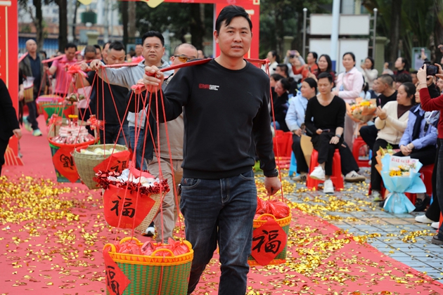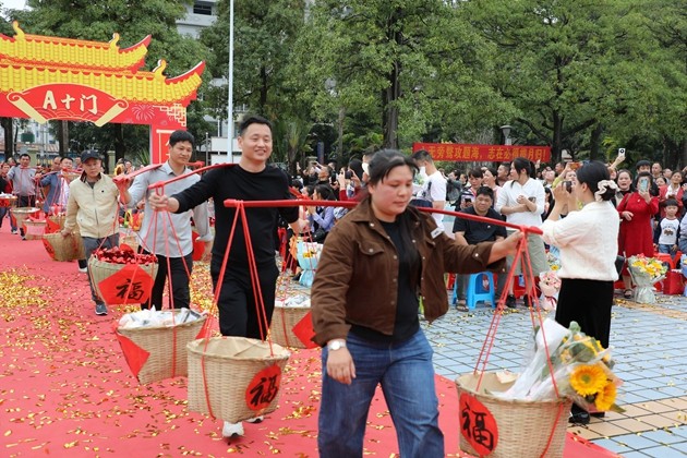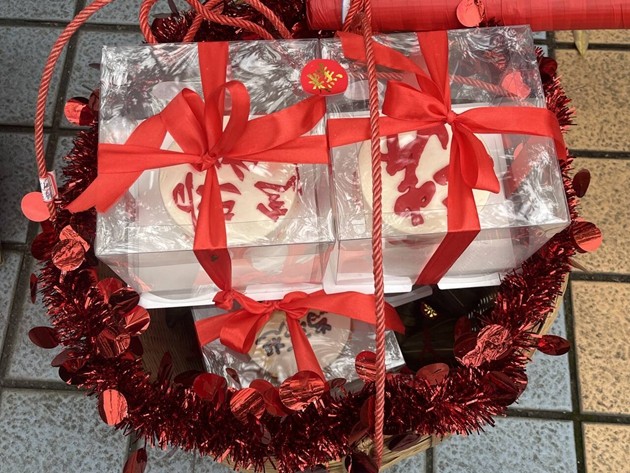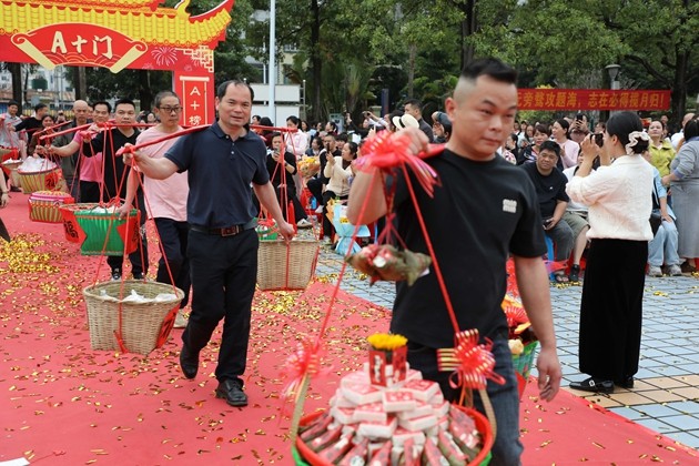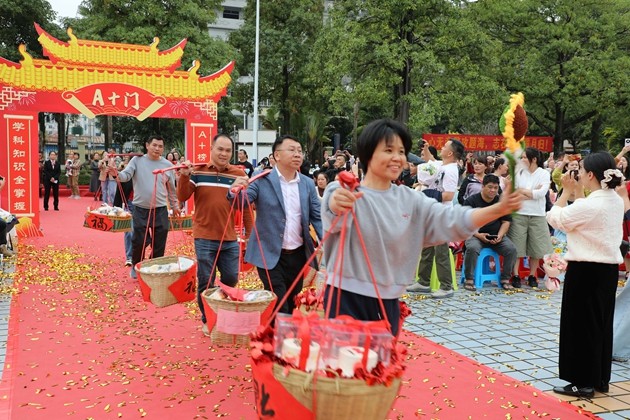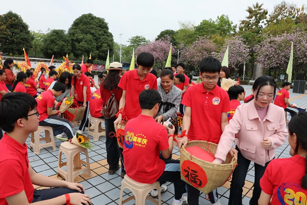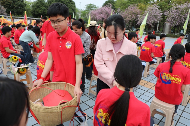 温情满溢的“糕粽”祝福环节将现场氛围推向高潮。各班家长代表肩挑彩篮、手捧果盘,将寓意“金榜题名”的糕点与粽子,连同满载期许的水果花束,一一送到孩子们手中。彩篮里,粽子与糕点缀着红绸,藏着“高中”的美好祈愿。春日繁花与红衣少年相映,家长的叮咛、老师的微笑交织成最暖的底色,家校同心的力量,在这一刻化作奔赴中考的滚烫底气。
