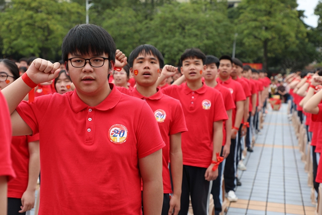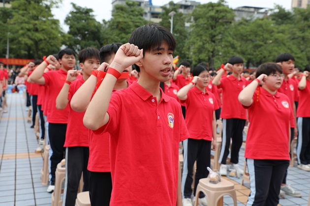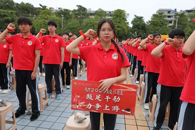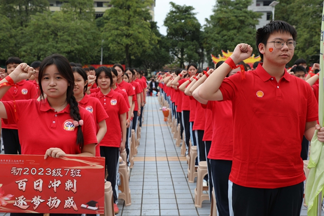 “不负父母期盼,不负恩师教诲,不负百日时光,全力以赴,决胜中考!”初三9班韦程瀚同学领誓,全体初三学子高举右拳,铮铮誓言响彻繁花校园,字字铿锵,是青春的呐喊,更是拼搏的承诺。