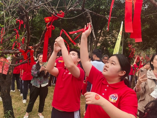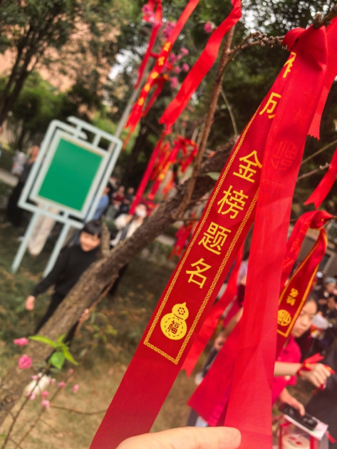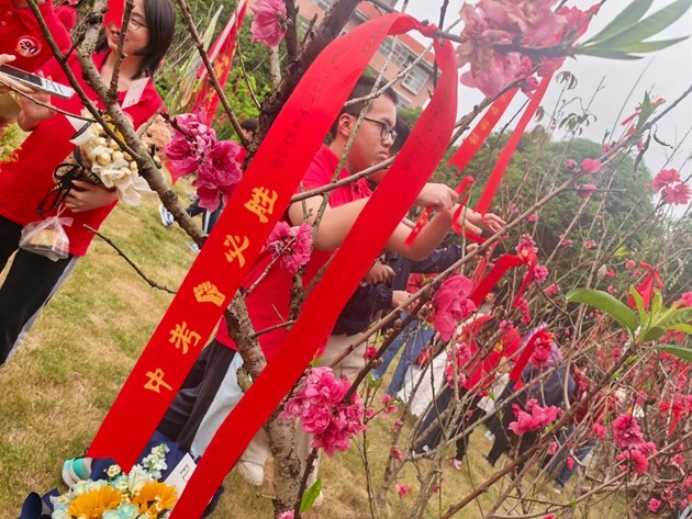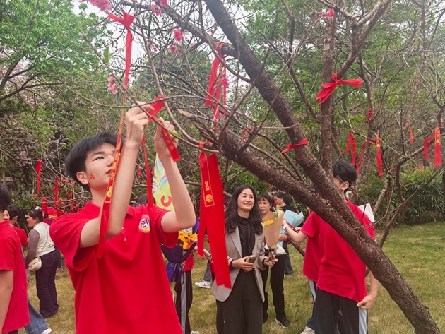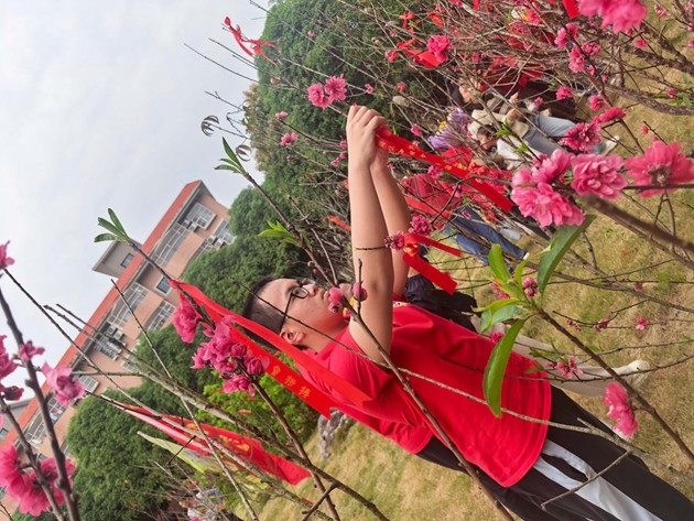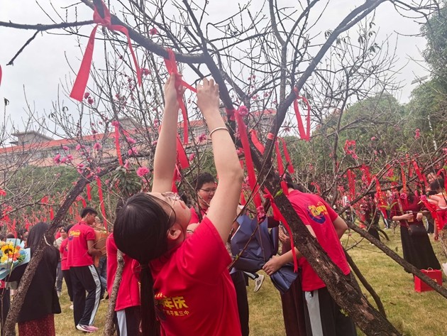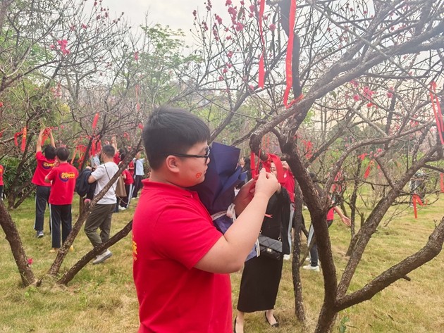 大会最后,各班学子与家长携手越过龙门,移步桃李园许下中考心愿。春日的桃李园花香阵阵,学子们将祈福带系于枝头,让繁花见证梦想,让春风寄予期盼。一字一句,在祈福带上立下中考决心,在接下来的一百天里,全力以赴、不负韶华、不负自己、不负时代。