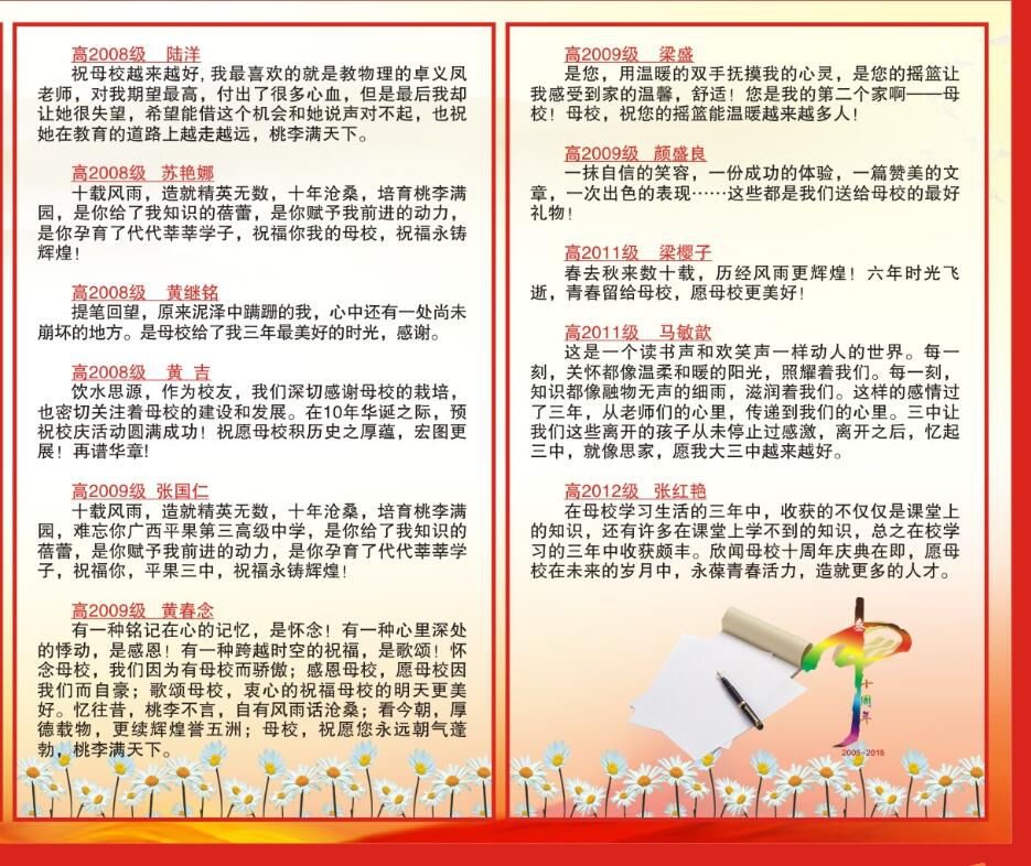 高2010级  李  鑫 广西大学  三中十年风雨兼程,培育桃李满园,三中十年青春如歌,谱写绚丽华章,祝母校生日快乐,愿下一个十年更加辉煌!