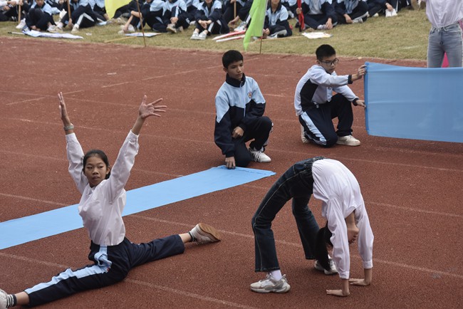 接下来是初一、初二、高一、高二年级各班依次展示他们精心筹备的精彩入场表演。或仿古或超前的妆造,或严肃或诙谐的伴奏、或搞怪或俏皮的表情、或柔美或生涩的舞姿,展示了同学对于中华民族开拓奋进精神的诠释及对开拓未来的憧憬。挥舞的旗帜、跃动的舞姿、整齐的队形,无一不显示出同学们的朝气与灵动。