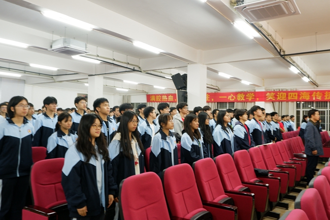 在庄严肃穆的音乐声中,全体师生开始了会议第一项议程:全体起立,奏唱中华人民共和国国歌和广西平果第三高级中学校歌。
