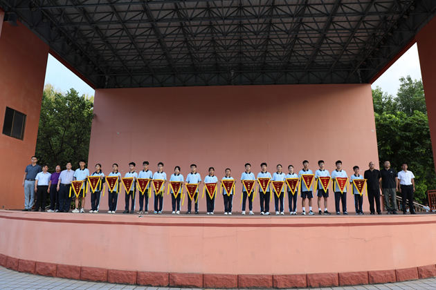 学生处副主任黄敏老师宣读获奖班级名单,黄尚泽董事长、高文广校长、黄春彬副校长、杨琦副校长、黄伟顾问、谢炬燊副校长、阮国辉副校长为获奖班级颁发锦旗并合影留念。
