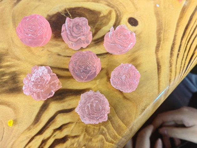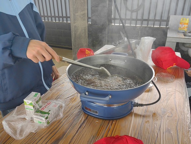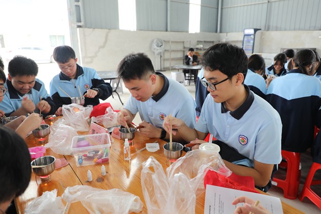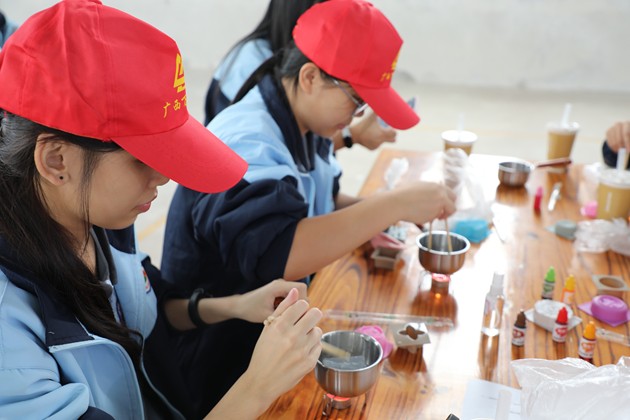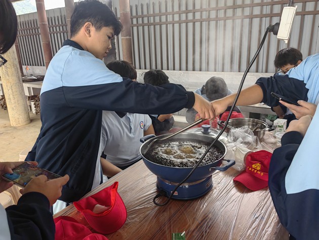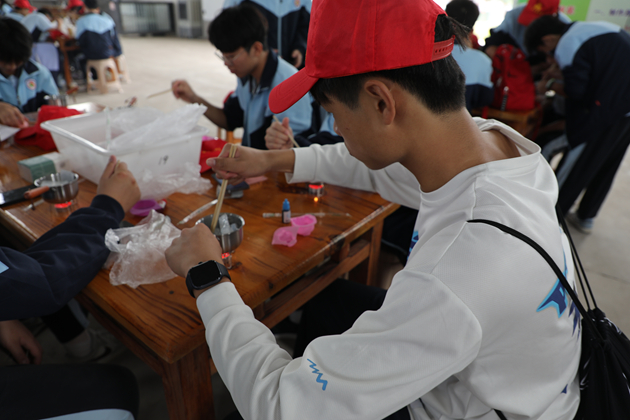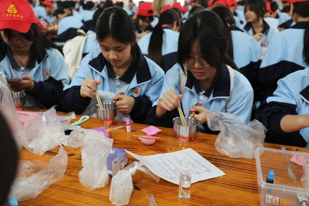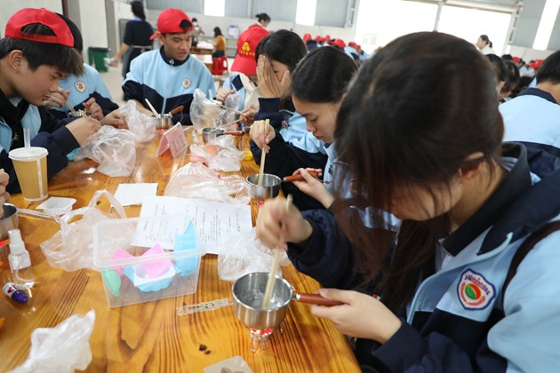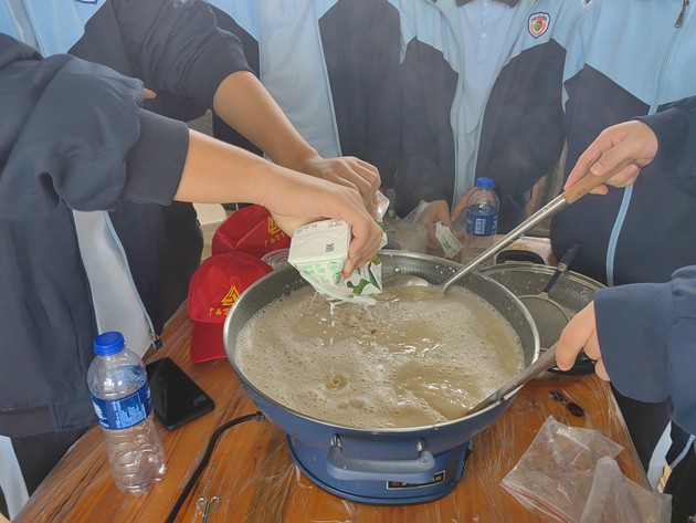 活动伊始,同学们便投入到“珍珠奶茶”与“手工皂”的制作中。在茶香袅袅的厨房区,大家认真熬煮珍珠、冲泡茶汤、调配奶香,每一步都专注而细致;而后又到手工皂制作区,从皂基融化、调色入模,到静待成型,每一环节都融入了化学知识与艺术想象。指尖流转的不仅是原料,更是对生活科学的初步体悟,小小作品里,藏着化学与美学的悄然对话。