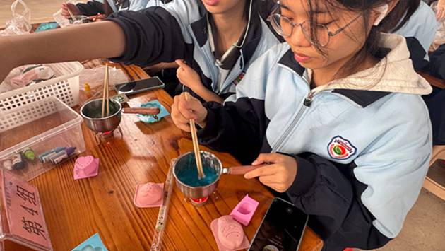 手工皂制作老师细致讲解了手工皂的制作原理—皂基与酵素奇妙的化学反应,同时着重强调安全注意事项后,同学们投身于实践中。在融化皂基之后,看混合物逐渐褪去油滑,凝成初雪般柔润的膏体。脱模时刻,当那块温润如玉的皂体完整滑落掌心,同学们的嘴角不可抑制地向上弯去他们互相展示各自的“作品”,原来最动人的化学,不在手工皂之中,而在这些年轻脸庞上,那由紧张到惊喜、由困惑到明悟的、慢慢漾开的笑脸。