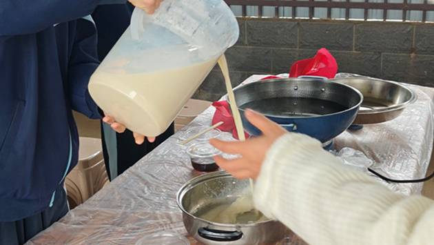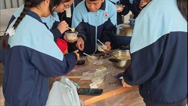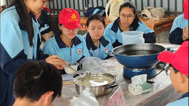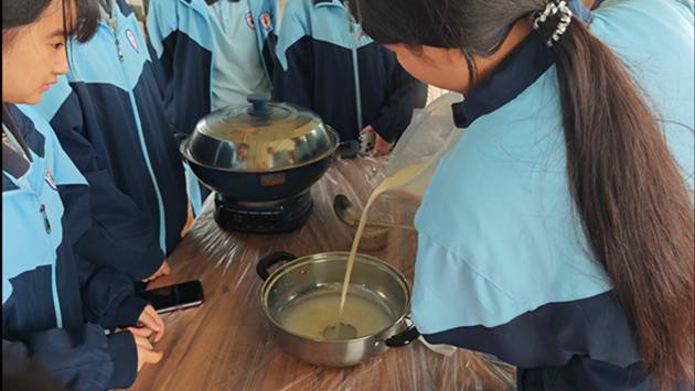 “点卤、搅拌、静置、调味……”在豆腐花制作环节,同学们围在操作台前,认真聆听老师讲解传统豆制品工艺原理,眼神里满是对手工制作的好奇。随后,大家戴上手套化身“小厨师”,从小心翼翼将豆浆加热至适宜温度,到精准控制卤水倒入量并轻轻搅拌,每一个步骤都细致专注。当乳白色的豆浆渐渐凝结成细腻嫩滑的豆腐花,再撒上一把香脆的花生碎,一口下去,清甜在舌尖蔓延。这不仅让同学们尝到了手工美食的独特风味,更在亲手操作中读懂了传统饮食文化里“慢工出细活”的匠心。