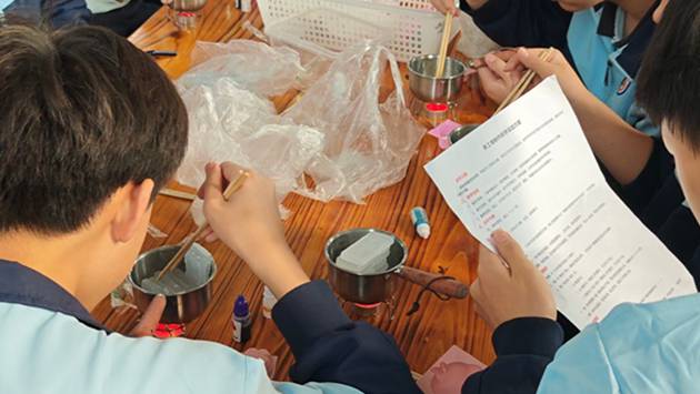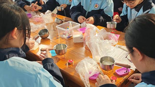 手工皂制作现场同样充满欢声笑语。基地老师先通过演示,清晰讲解皂基融化、精油添加、颜色调配、模具浇筑等关键步骤,还分享了不同精油的护肤功效。随后,同学们化身“创意设计师”,尽情发挥想象:喜欢清新风格的同学,将薄荷精油与淡绿色色素混合,做出像“小冰块”一样的透明皂;偏爱温柔风的同学,则加入薰衣草精油和淡紫色色素,搭配星星、月亮造型的模具,打造出浪漫感十足的手工皂。待皂基冷却凝固,同学们捧着自己亲手制作的专属皂,脸上满是成就感。这一环节不仅让大家掌握了手工皂的制作技巧,更在创意表达中激发了审美与创新思维。