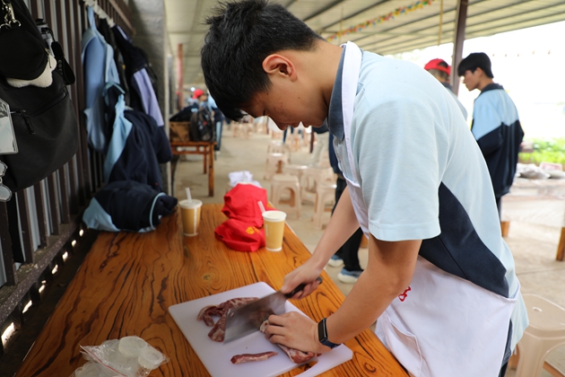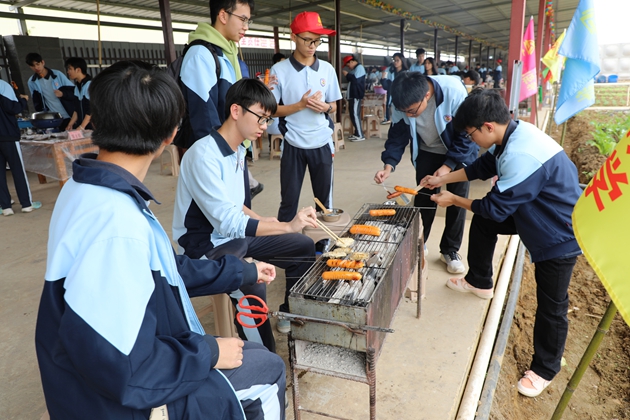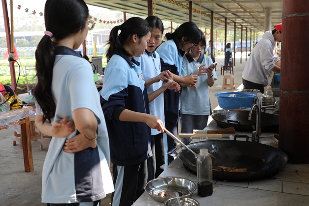 园间灶台烟火浓,协作烹鲜乐未穷。烹饪区与蔬果园联袂构成的实践天地里,一场热火朝天的厨艺比拼精彩上演。同学们分组协作,各展其能。摘菜洗切,身影穿梭有序;掌勺调味,火光映照专注。锅铲声、翻炒声交织成曲,寻常食材在合作中化为盘中山水。