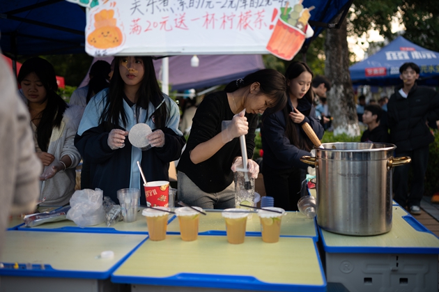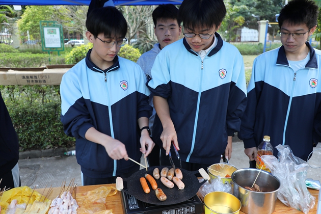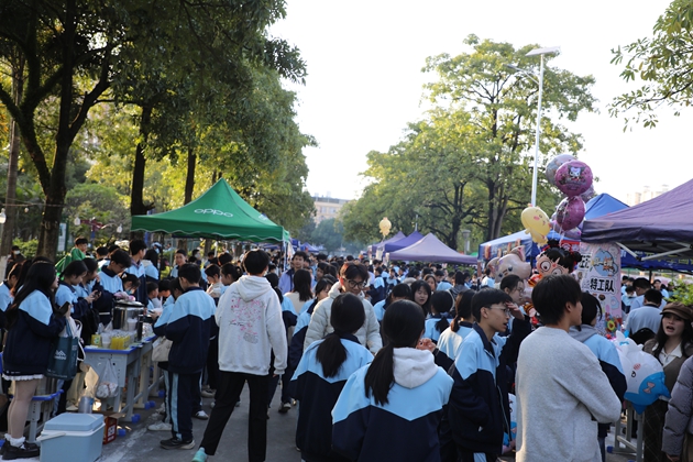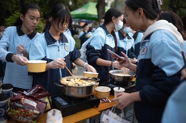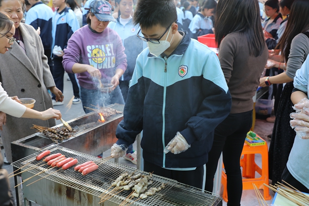 活动现场,美食一条街无疑是最热闹的区域。各班摊位整齐排列,五彩的招牌迎风招展,吆喝声、欢笑声此起彼伏。同学们化身“小掌柜”,分工明确、配合默契:有的系着围裙,在热锅前熟练地翻炒着食材,金黄酥脆的炸薯条、香气扑鼻的烤肠、酸甜可口的手工糖葫芦接连出锅;有的专注地调制着饮品,手打柠檬茶的清香、鲜榨果汁的甘甜,吸引了大批师生驻足;还有的负责摆盘售卖,将精心制作的寿司、蛋挞、凉拌菜摆放得错落有致,还贴心地准备了试吃小份。从食材采购、清洗加工,到定价售卖、收银记账,每一个环节都由学生亲力亲为,他们脸上洋溢着认真又兴奋的神情,用亲手制作的美食,传递着新年的喜悦。