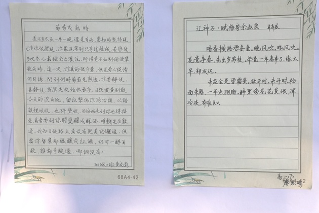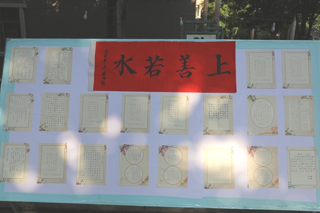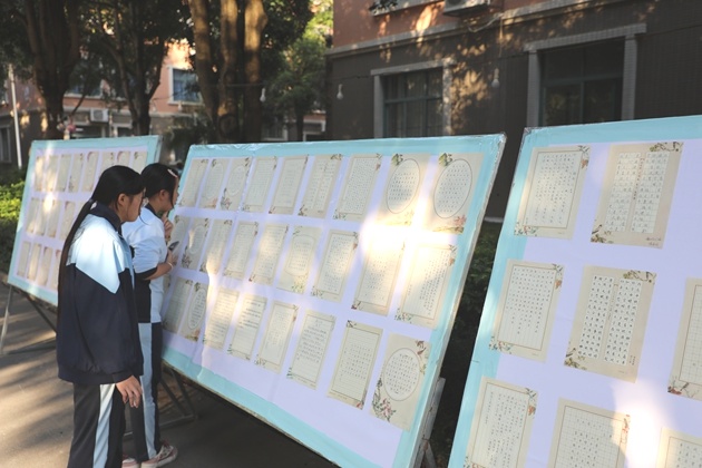 与美食街的烟火气相得益彰的,是学生书画作品展的雅致氛围。校道两侧,一幅幅作品整齐张贴,笔墨丹青间尽显学子才情。楷书工整隽秀,行书潇洒飘逸,一笔一划都凝聚着同学们的勤学苦练;水彩画色彩明丽,素描作品线条细腻,或描绘校园美景,或勾勒梦想蓝图,或抒发家国情怀,每一幅作品都构思精巧、笔触细腻。
